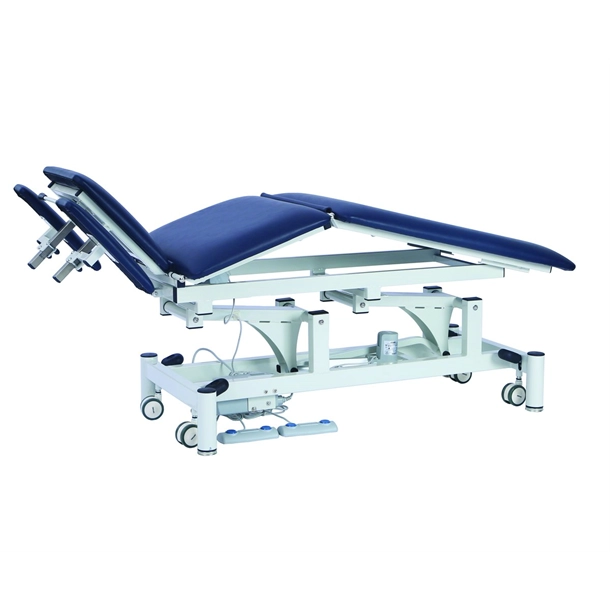 Pacific Medical 5 Section/ 2 Motor Electric Hi-Lo Treatment Table, Navy Blue Upholstery, 66cm x 195cm, 250kg SWL, Retractable Wheels
