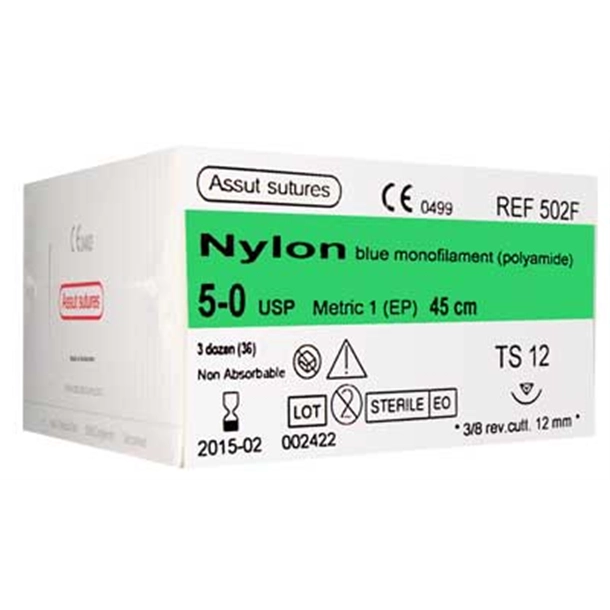 Assut nylon is a blue monofilament, polyamide suture with high tensile strength. The uniform and smooth suture surface permits effortless passage through skin and tissue with minimal trauma and is extremely well tolerated.