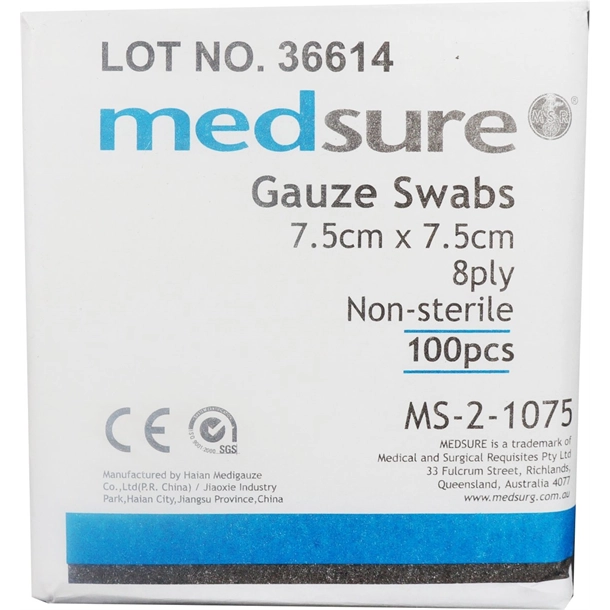 Medsure Non-Sterile Gauze Swabs 8ply 7.5cm x 7.5cm. Pack of 100